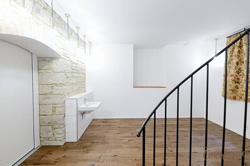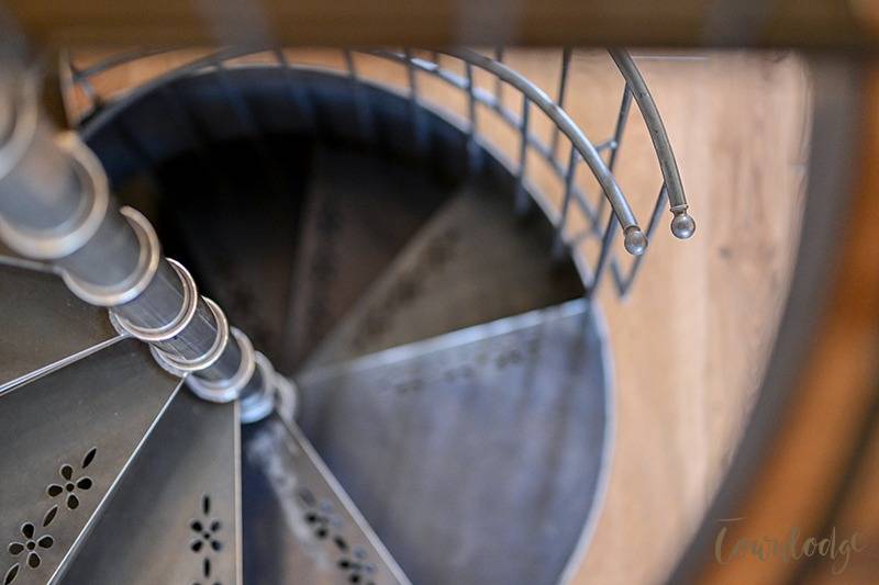 Wendeltreppe zu den drei Räumen und zwei Badezimmern im Obergeschoss