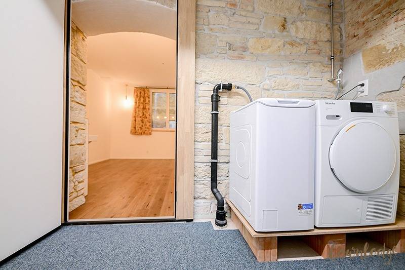 Eigene Geräte im Bad: Miele 9kg Waschmaschine und -trockner; Chromstahl-Schrank für Aufbewahrung