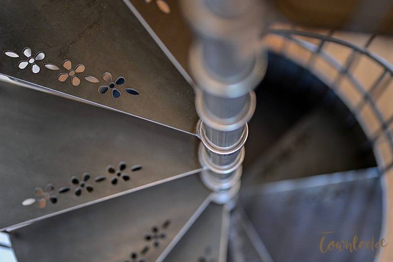 Wendeltreppe zu den drei Räumen und zwei Badezimmern im Obergeschoss; Material: kaltgewalzter Flachstahl